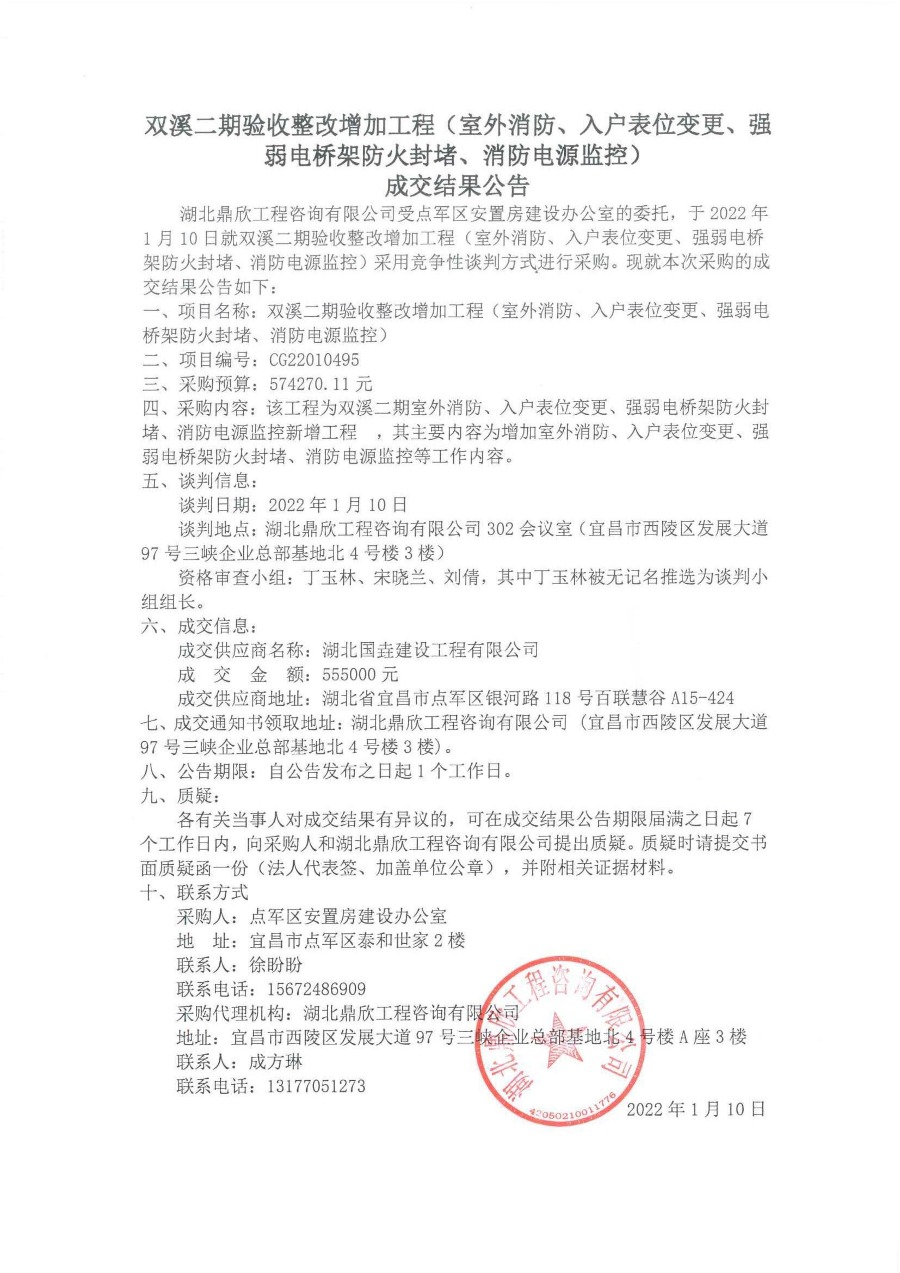 雙溪二期驗收整改增加工程(室外消防、入戶表位變更、強弱電橋架防火封堵、消防電源監(jiān)控)?成交結果公告