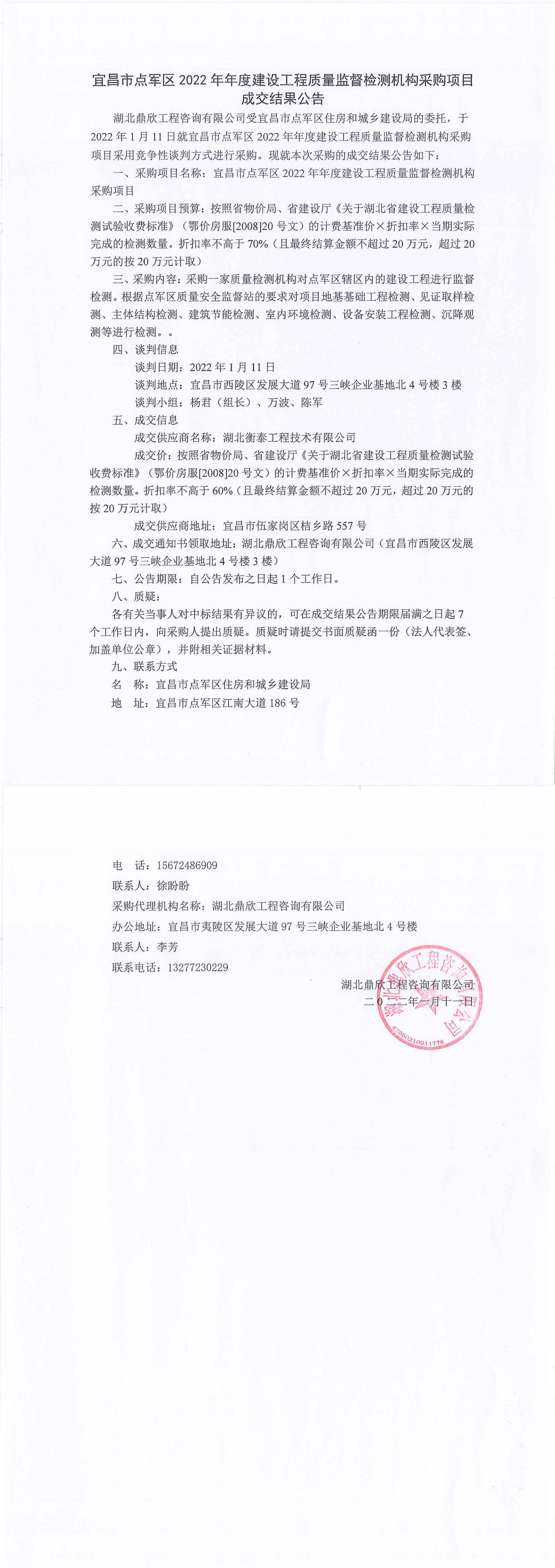 宜昌市點(diǎn)軍區(qū)2022年年度建設(shè)工程質(zhì)量監(jiān)督檢測機(jī)構(gòu)采購項目成交公告