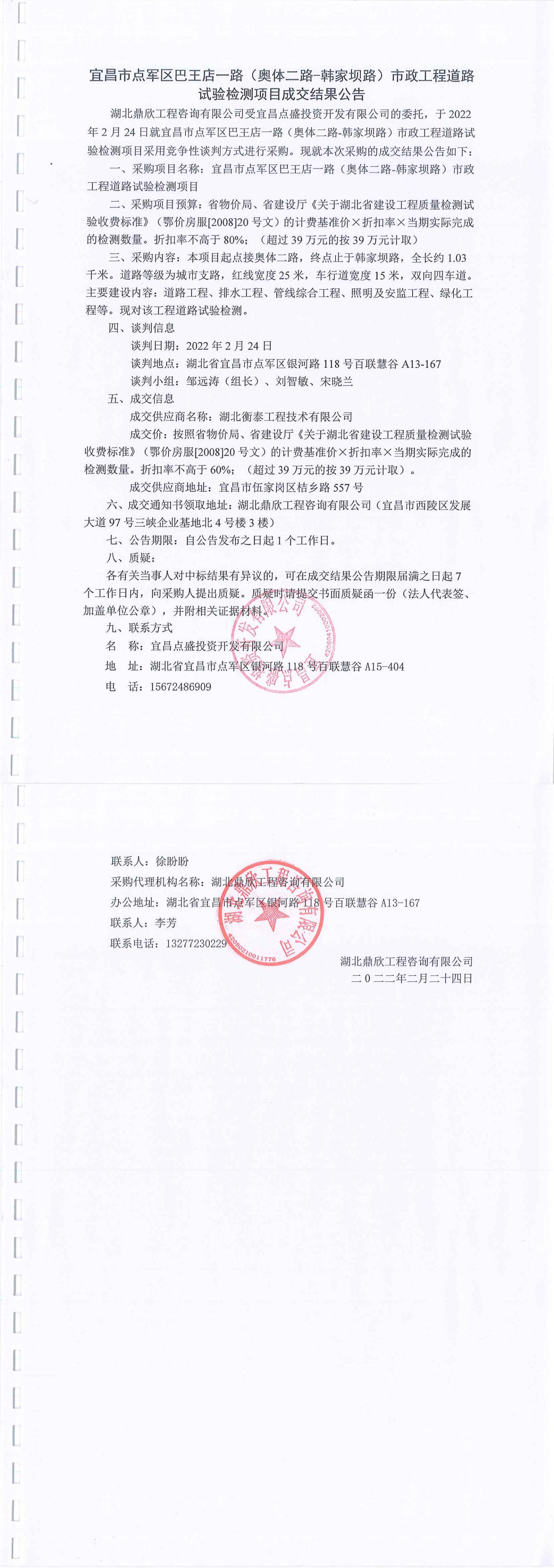 宜昌市點(diǎn)軍區(qū)巴王店一路(奧體二路-韓家壩路)市政工程道路試驗(yàn)檢測項(xiàng)目成交公告