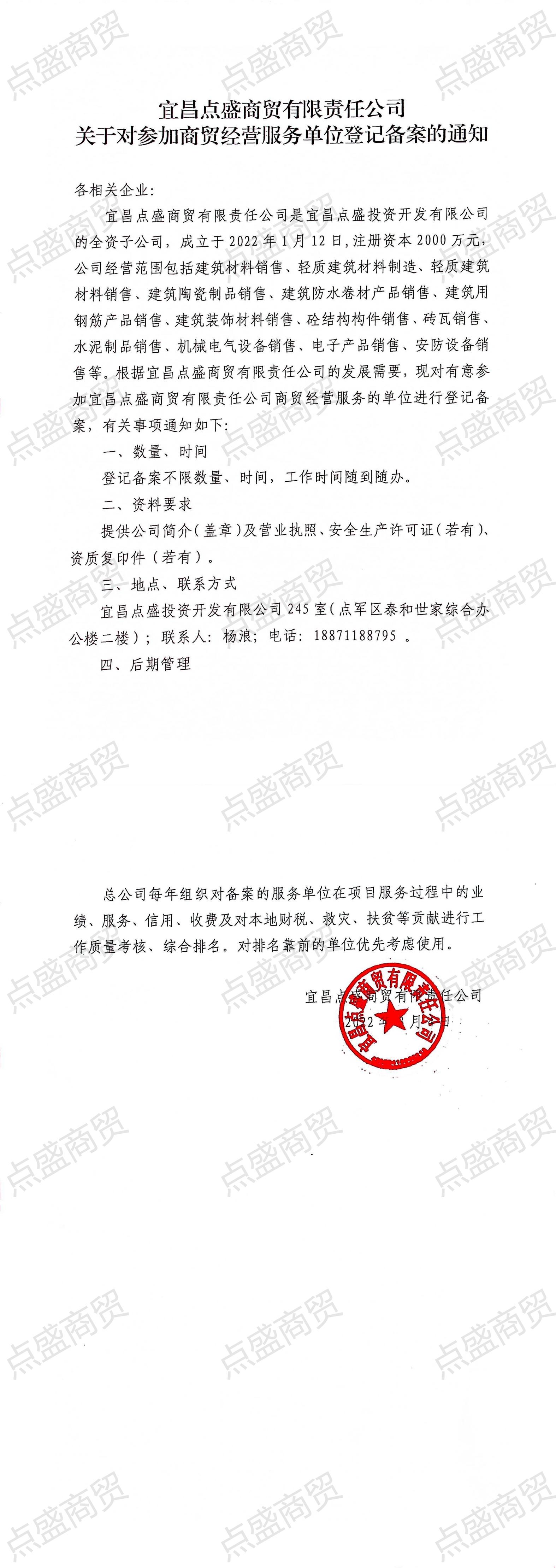 宜昌點盛商貿有限責任公司關于對參加商貿經營服務單位登記備案的通知