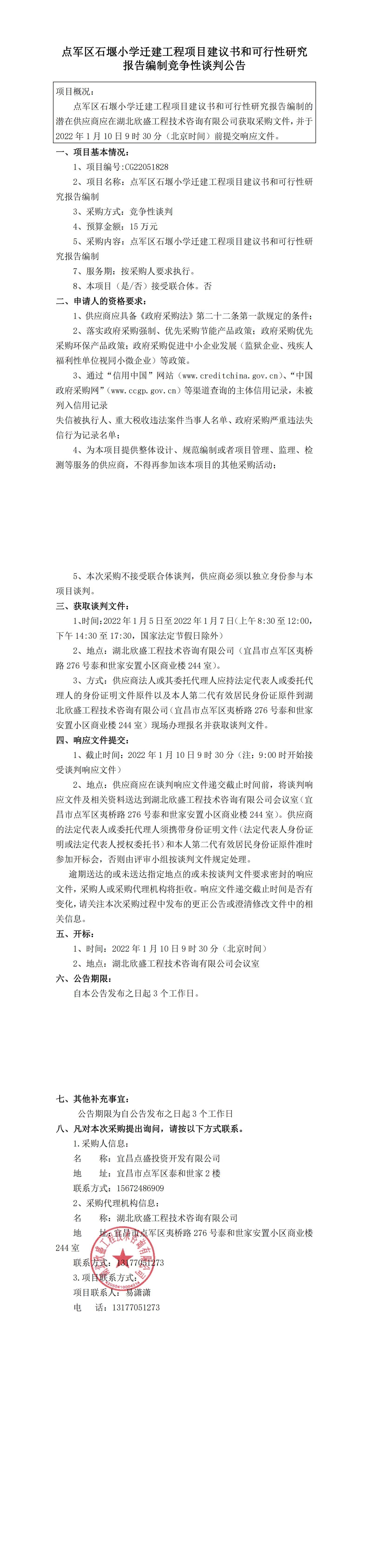 點軍區(qū)石堰小學(xué)遷建工程項目建議書和可行性研究報告編制競爭性談判公告