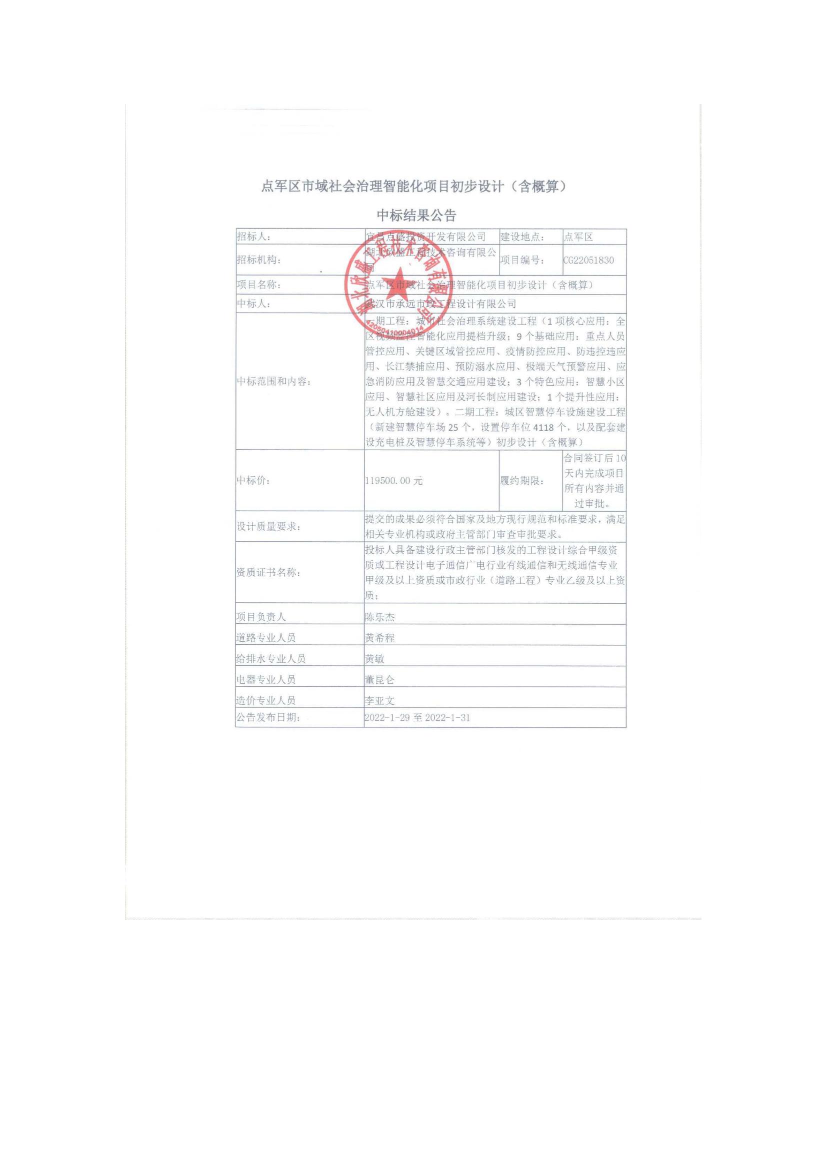 點軍區(qū)市域社會治理智能化項目初步設(shè)計(含概算)中標(biāo)結(jié)果公告