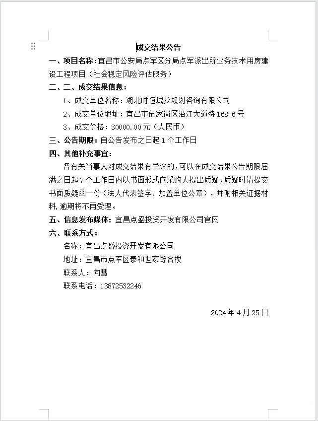 宜昌市公安局點軍區(qū)分局點軍派出所業(yè)務技術用房建設工程項目(社會穩(wěn)定風險評估服務)成交公告