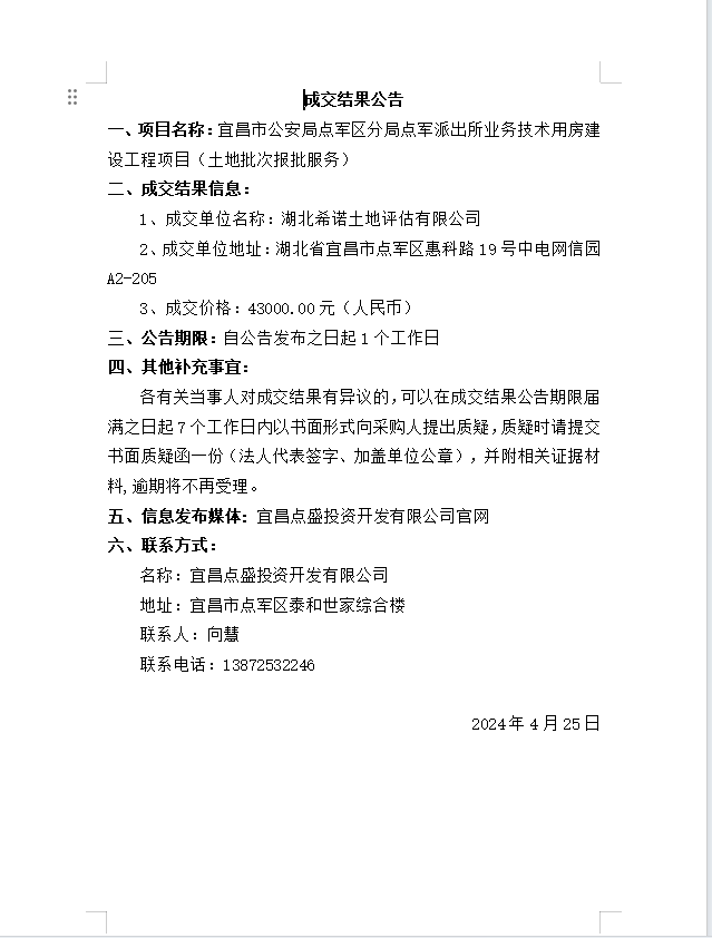 宜昌市公安局點軍區(qū)分局點軍派出所業(yè)務技術用房建設工程項目 (土地批次報批服務)成交公告