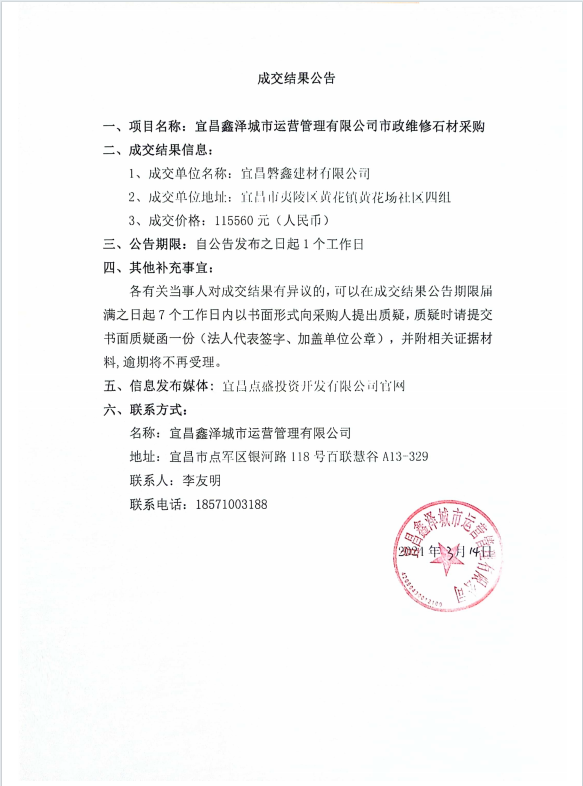 宜昌鑫澤城市運營管理有限公司市政維修石材采購項目成交公告