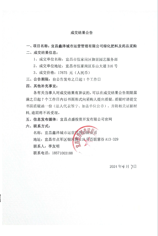 宜昌鑫澤城市運(yùn)營(yíng)管理有限公司綠化肥料及藥品采購(gòu)項(xiàng)目詢(xún)價(jià)公告