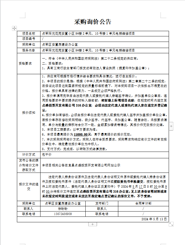點軍陽光花苑安置小區(qū)9#樓2單元、10號樓1單元電梯維修項目詢價公告