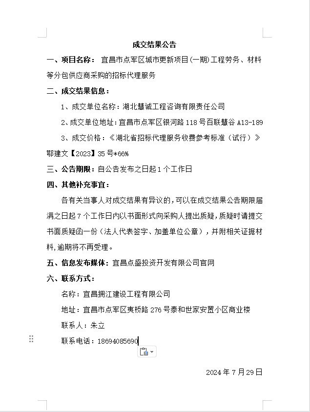 宜昌市點(diǎn)軍區(qū)城市更新項(xiàng)目(一期)工程勞務(wù)、材料等分包供應(yīng)商采購(gòu)的招標(biāo)代理服務(wù)成交結(jié)果公告