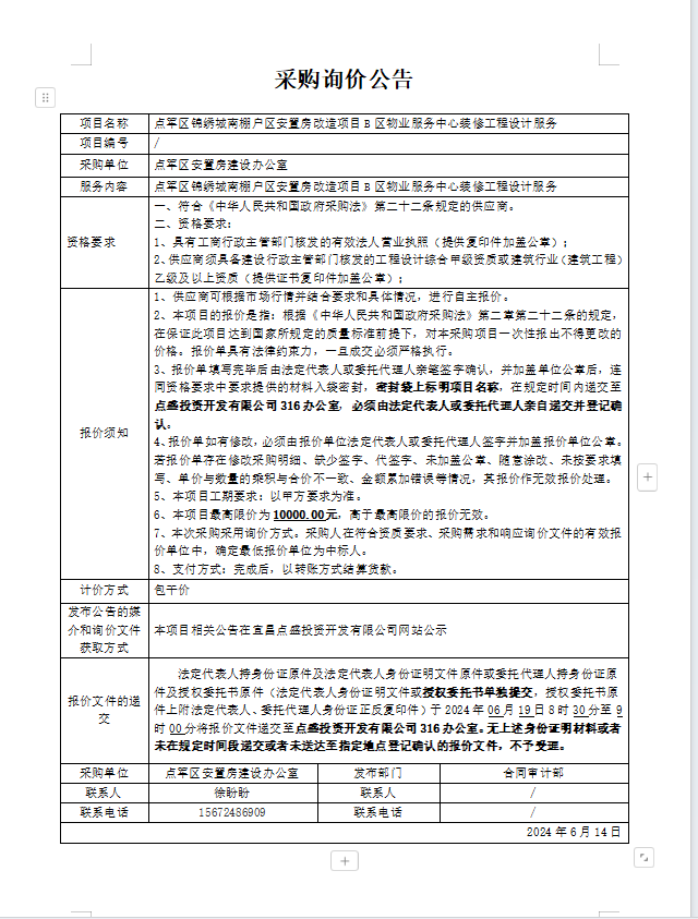 點軍區(qū)錦繡城南棚戶區(qū)安置房改造項目B區(qū)物業(yè)服務中心裝修工程設計服務詢價公告