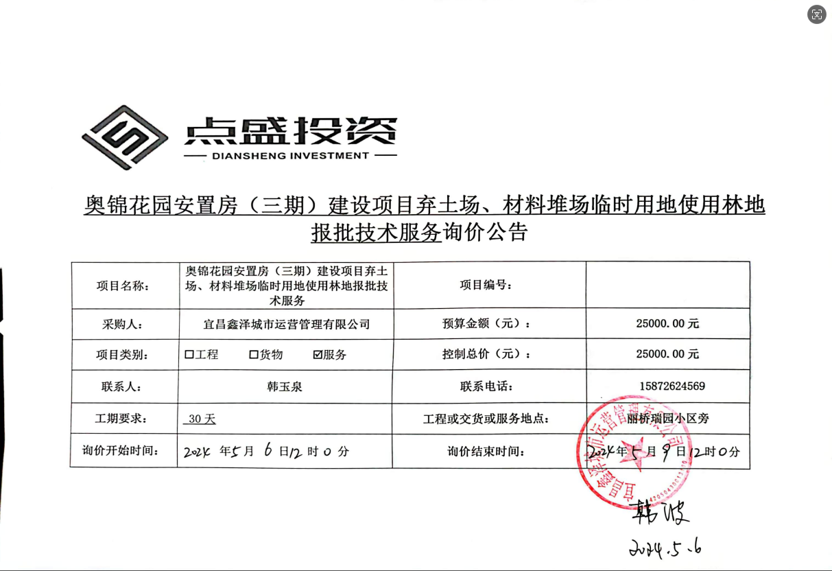 奧錦花園安置房(三期)建設(shè)項(xiàng)目棄土場、材料堆場臨時(shí)用地使用林地報(bào)批技術(shù)服務(wù)詢價(jià)公告