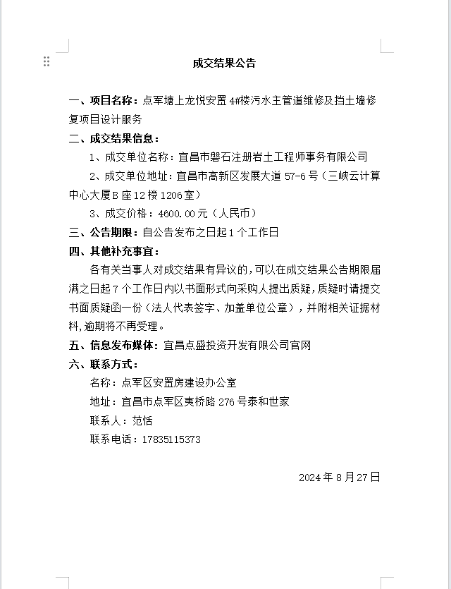 點(diǎn)軍塘上龍悅安置4#樓污水主管道維修及擋土墻修復(fù)項(xiàng)目設(shè)計(jì)服務(wù)成交公告