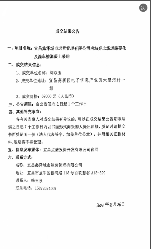 宜昌鑫澤城市運(yùn)營(yíng)管理有限公司南站棄土場(chǎng)道路硬化及洗車槽混凝土采購(gòu)項(xiàng)目成交公告