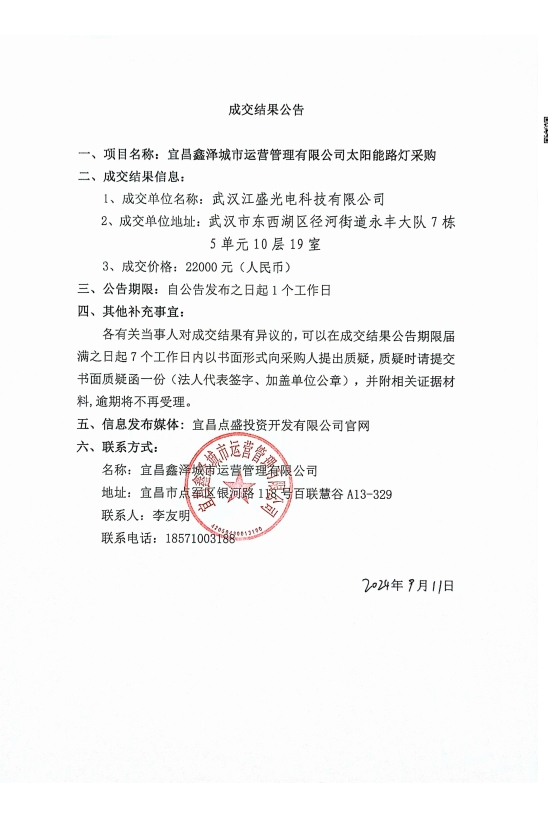 宜昌鑫澤城市運(yùn)營(yíng)管理有限公司太陽能路燈采購(gòu)項(xiàng)目成交公告
