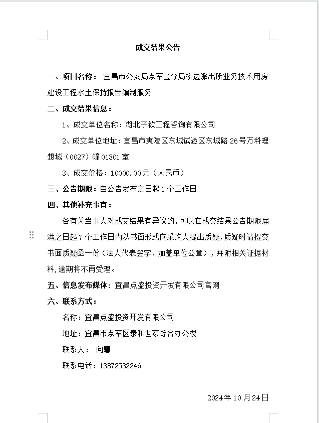 宜昌市公安局點(diǎn)軍區(qū)分局橋邊派出所業(yè)務(wù)技術(shù)用房建設(shè)工程水土保持報告編制服務(wù)成交公告