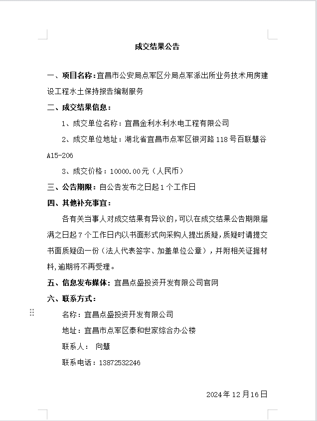 宜昌市公安局點軍區(qū)分局點軍派出所業(yè)務(wù)技術(shù)用房建設(shè)工程水土保持報告編制服務(wù)成交公告