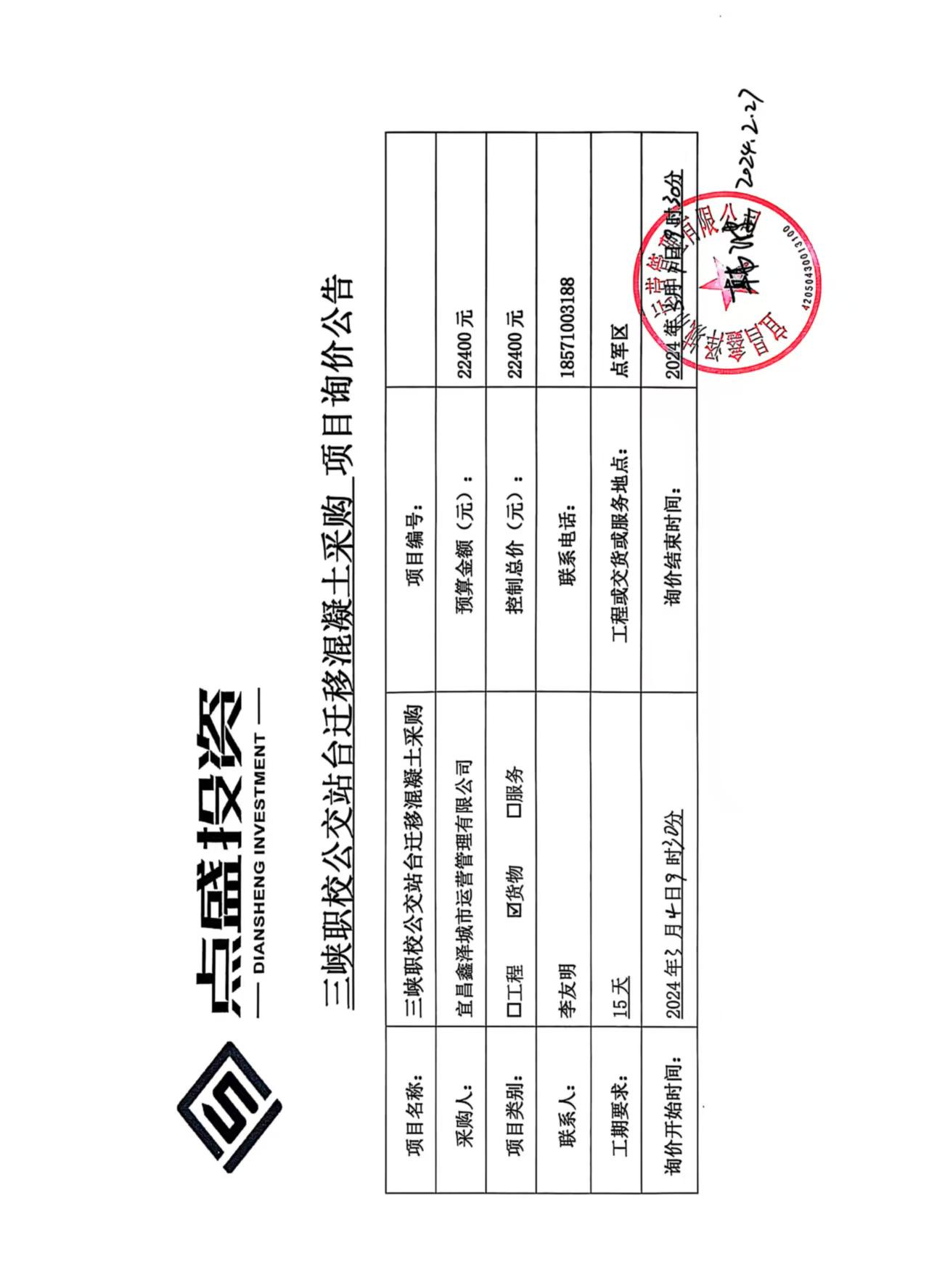三峽職校公交站臺(tái)遷移混凝土采購(gòu)詢(xún)價(jià)公告
